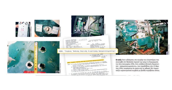 Σύμφωνα με την έκθεση «βλητικής διερεύνησης-πραγματογνωμοσύνης», υπ’ αριθμόν 3022/13/5053-στ, «13+1» σελίδων που παρουσιάζει η «Κ», τα τμήματα του ελικοπτέρου ανασύρθηκαν μεταξύ Καλολίμνου και Ιμίων. «Κατά την πρώτη εξέταση των τμημάτων του ελικοπτέρου (17 Φεβρουαρίου), επί του καταστρώματος του “Φ/Θ Θέτις”, από αξιωματικούς του Πολεμικού Ναυτικού υπεδείχθησαν ορισμένες διατρήσεις (οπές, εντυπώματα) για τις οποίες υπήρξε η εκτίμηση-υποψία ότι θα μπορούσαν να έχουν προκληθεί από πυρά πυροβόλων όπλων». Οι τρεις πραγματογνώμονες αξιοποίησαν, μεταξύ άλλων, όργανα μικρομετρήσεων, στεροσκόπιο, μικροσκόπιο, μεγεθυντικούς φακούς.