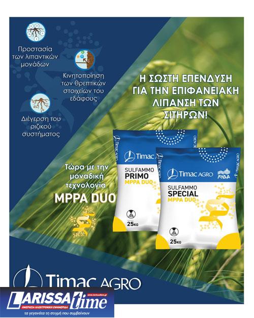 Η Timac Agro I ΛΥ∆Α εξειδικεύεται στη βελτίωση των ποιοτικών χαρακτηριστικών των αγροτικών προϊόντων, παρεµβαίνοντας στις καλλιέργειες µε τα κατάλληλα σκευάσµατα στον κατάλληλο χρόνο. Έτσι και στην περίπτωση του σιταριού, δύο είναι τα προϊόντα που πρέπει να εφαρµοστούν στο επόµενο διάστηµα, ώστε να επιτύχουµε υψηλά ποσοστά πρωτεΐνης.