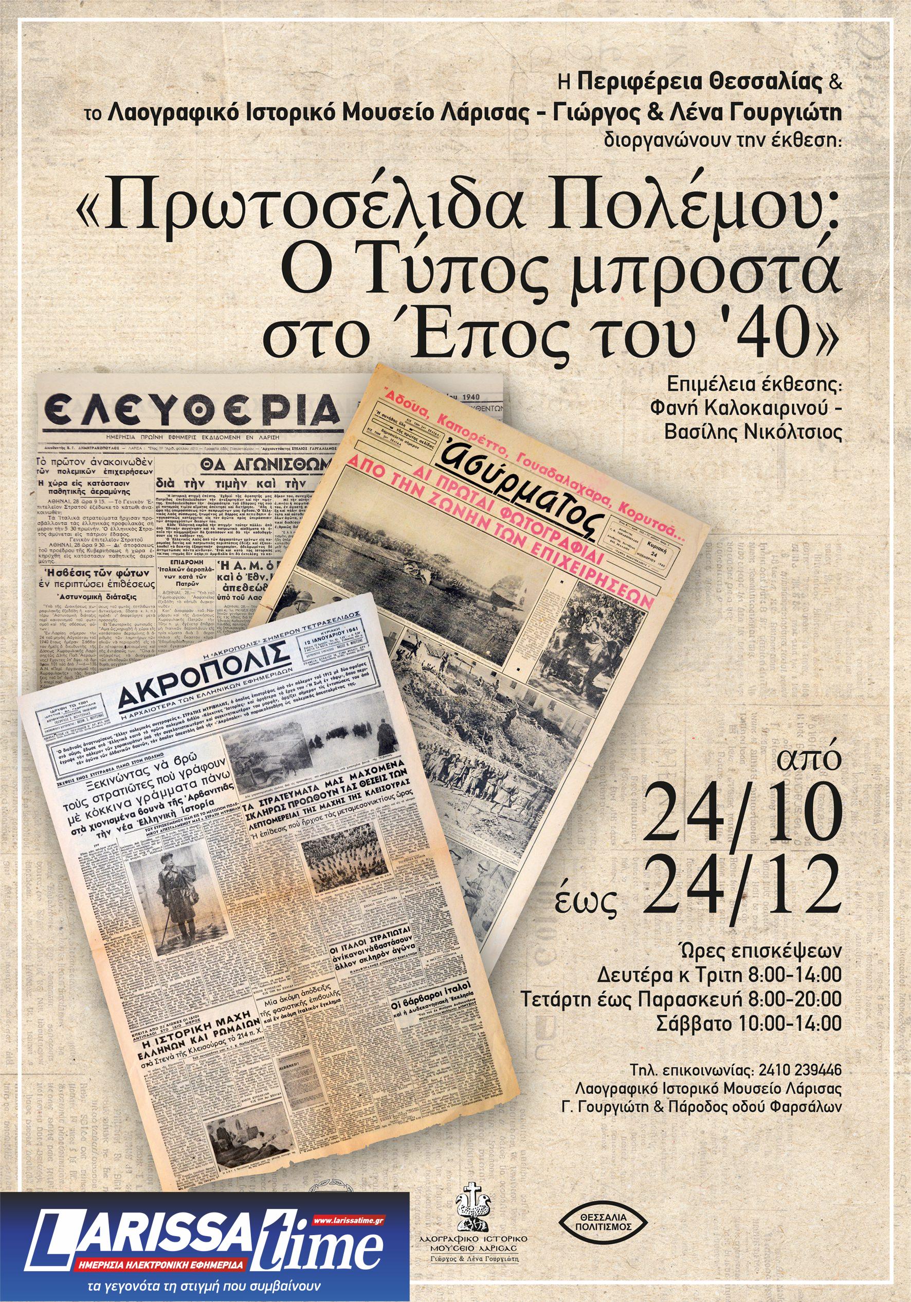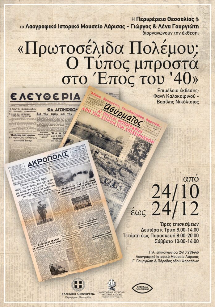 Η έκθεση εγκαινιάζεται στις 24 Οκτωβρίου 2025, στις 18.30 στο Λαογραφικό Ιστορικό Μουσείο Λάρισας – Γιώργος και Λένα Γουργιώτη και θα διαρκέσει έως τις 24 Δεκεμβρίου. Η έκθεση παρουσιάζει τον τρόπο με τον οποίο ο ελληνικός Τύπος κατέγραψε και παρουσίασε τα δραματικά γεγονότα του Οκτωβρίου του 1940 και των πρώτων μηνών του πολέμου.