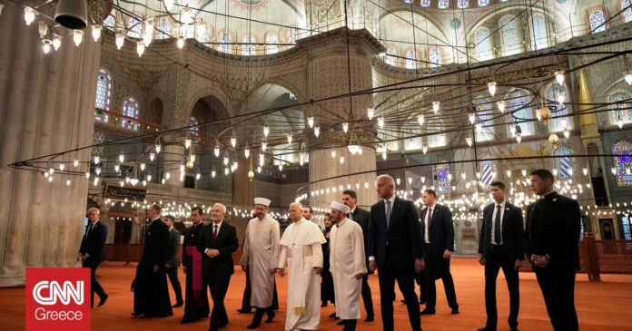 Το Μπλε Τζαμί της Κωνσταντινούπολης επισκέφθηκε το Σάββατο (29/11) ο Πάπας Λέoντας επισκέφθηκε βγάζοντας τα παπούτσια του σε ένδειξη σεβασμού, αλλά χωρίς να φανεί να προσεύχεται.