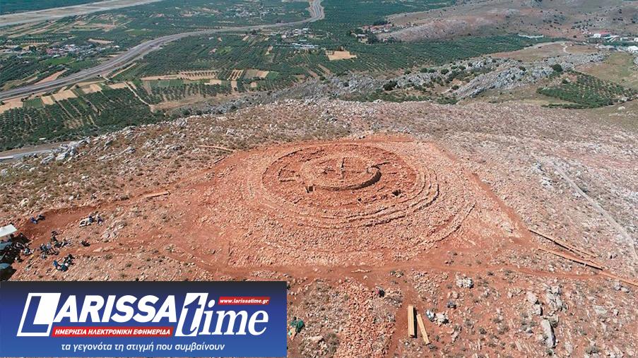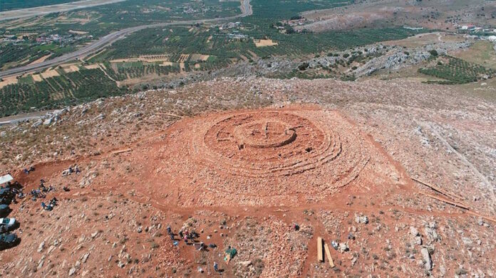 Το μοναδικό αυτό για την Αρχαιολογία εύρημα είναι κυκλικό στο σχήμα και βρίσκεται στο πιο ψηλό σημείο του λόφου, σε τμήμα της κορυφής που είχε απαλλοτριωθεί για την τοποθέτηση συστημάτων επιτήρησης (ραντάρ) του νέου αερολιμένα. Οι οκτώ επάλληλοι δακτύλιοι που αναπτύσσονται σε διαφορετικά υψομετρικά επίπεδα και διαμορφώνουν έναν μυστηριώδη κύκλο μάς φέρνουν στον νου τις παρόμοιες κατασκευές που βλέπουμε από την Εποχή του Χαλκού σε διάφορες χώρες της Εγγύς Ανατολής, με την οποία ως γνωστόν η Μινωική Κρήτη είχε στενή σχέση, όπως αντίστοιχα με την Αίγυπτο και την ευρύτερη περιοχή της Μεσογείου.