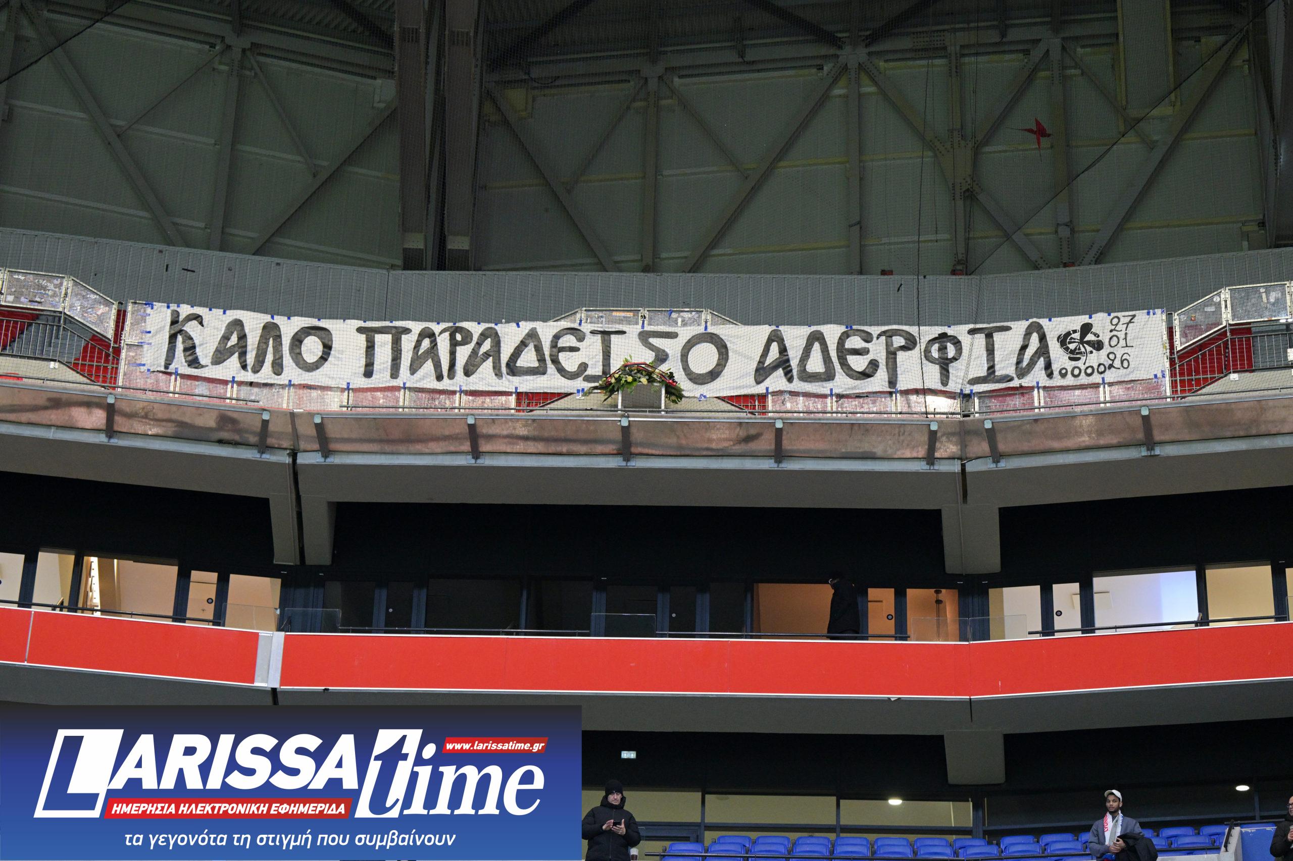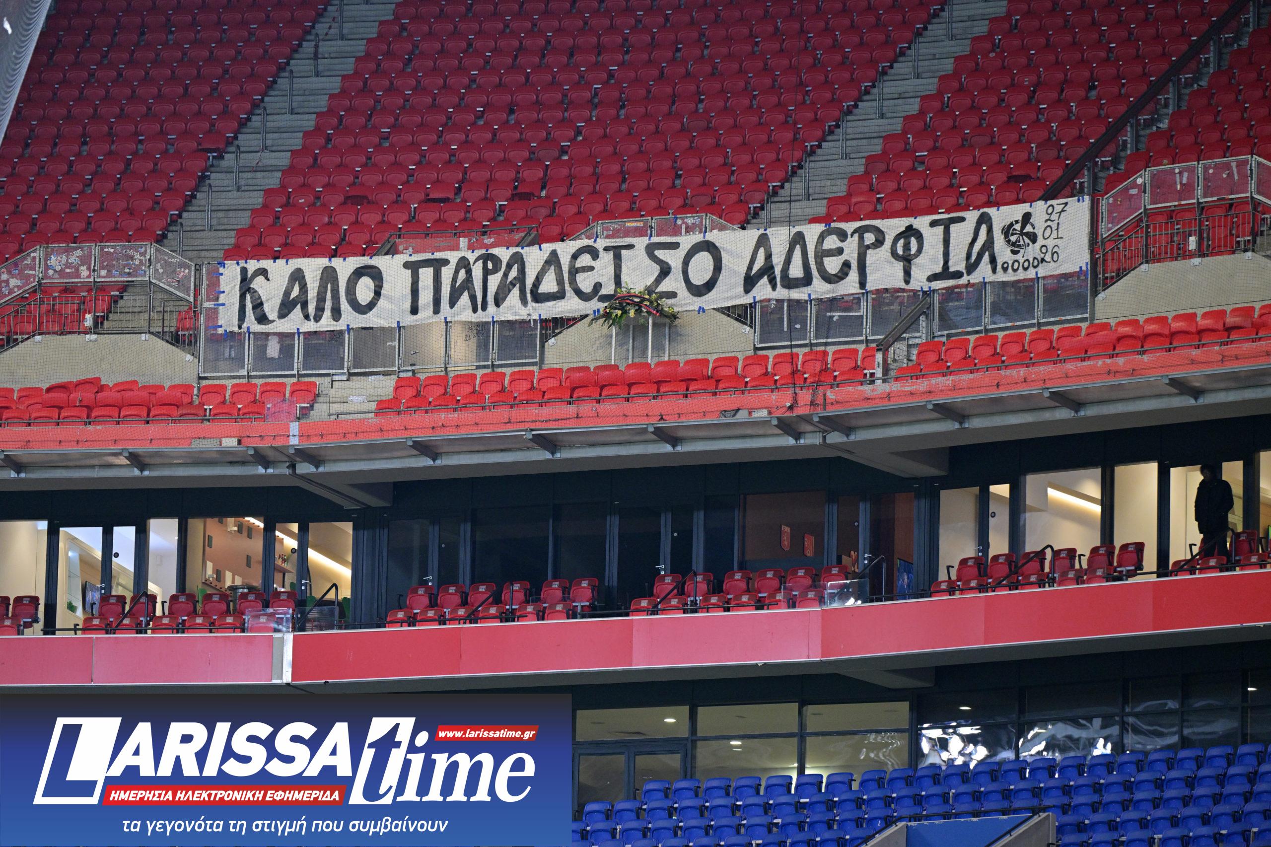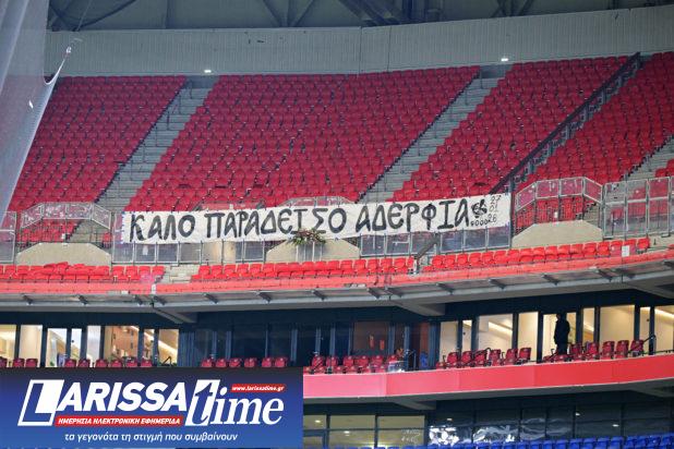 «Καλό παράδεισο αδέλφια», γράφει το πανό των φίλων του ΠΑΟΚ, στην κερκίδα που θα φιλοξενούσε τους οπαδούς του Δικεφάλου.