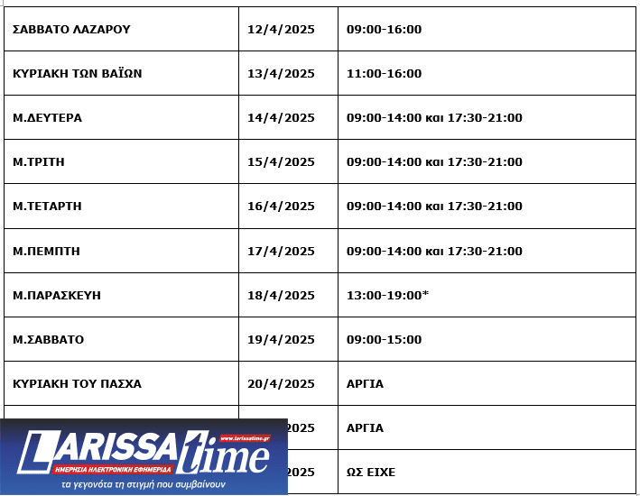 Ο Εμπορικός Σύλλογος Λάρισας, ανακοίνωσε το προτεινόμενο ωράριο λειτουργίας των εμπορικών καταστημάτων της πόλης μας, το οποίο θα ισχύσει για την εορταστική περίοδο του Πάσχα 2025.