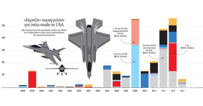 Τουλάχιστον αυτό προκύπτει μέσα από την επεξεργασία των πωλήσεων αμερικανικών εξοπλισμών στο εξωτερικό που υπάγονται στον βραχίονα Foreign Military Sales. Σύμφωνα με ειδική μελέτη της ευρωπαϊκής δεξαμενής σκέψης Bruegel, η Ευρώπη έχει καταστεί ο κύριος αγοραστής αμερικανικών εξοπλισμών ήδη από το 2020. Οι περισσότερες από τις αγορές αφορούν συστήματα αεράμυνας και μαχητικά αεροσκάφη, όπως τα F-35 και F-16.
