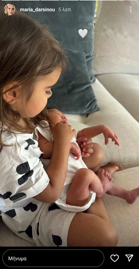 Το πρωί του Σαββάτου, 15 Ιουνίου, η Μαρία Δαρσινού μοιράστηκε με τους διαδικτυακούς της φίλους μια συγκινητική ανάρτηση στον προσωπικό της λογαριασμό στο Instagram. Η φωτογραφία δείχνει τη μικρή Βαλέρια να κάθεται στον καναπέ του σαλονιού και να κρατάει στην αγκαλιά της τον νεογέννητο αδερφό της. Αυτή είναι η πρώτη φωτογραφία που δημοσιεύει με το προσωπάκι του μικρού, του οποίου το όνομα δεν έχει ανακοινωθεί ακόμα.