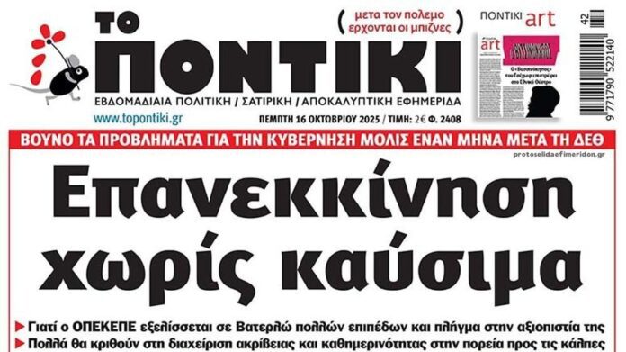 Διαβάστε το πρωτοσέλιδο της εφημερίδας «Το Ποντίκι» σήμερα 16/10/2025.