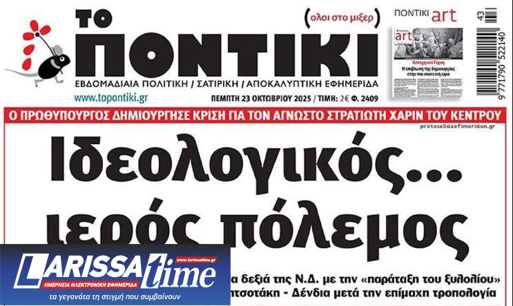 Διαβάστε το πρωτοσέλιδο της εφημερίδας «Το Ποντίκι» σήμερα 23/10/2025.