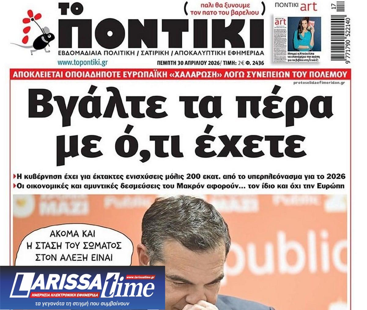 Διαβάστε το πρωτοσέλιδο της εφημερίδας «Το Ποντίκι» σήμερα 30/4/2026.