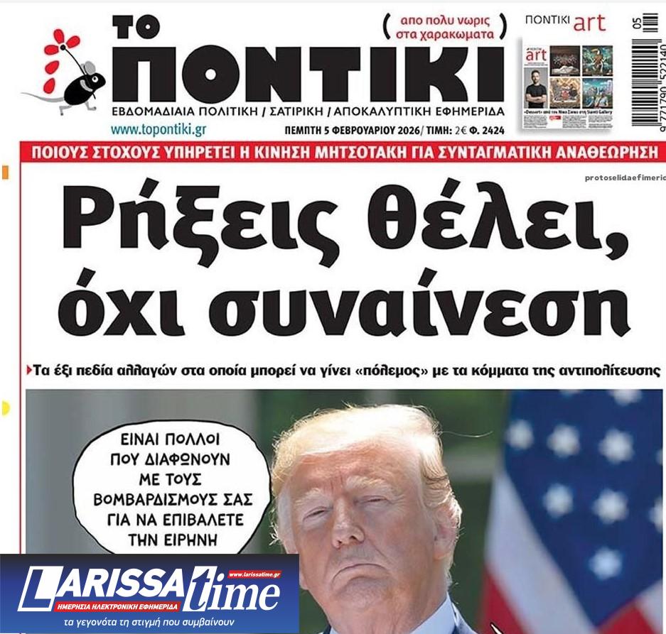 Διαβάστε το πρωτοσέλιδο της εφημερίδας «Το Ποντίκι» σήμερα 5/2/2026.