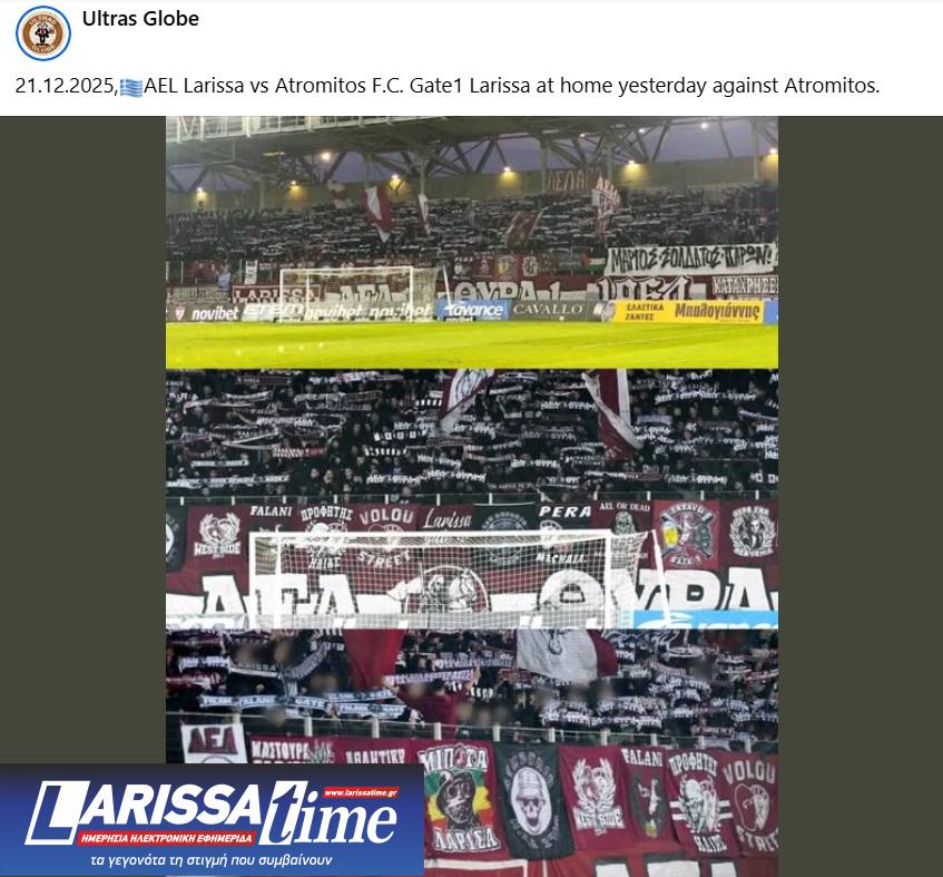 Μία οπαδική σελίδα στο facebook, Ultras Globe, η οποία αριθμεί περισσότερα από 175.000 μέλη, ανάρτησε για ακόμα μια φορά φωτογραφίες από την εξέδρα των οργανωμένων της ΑΕΛ από την εντός έδρας αναμέτρηση με τον Ατρόμητο, από το AEL FC ARENA.
