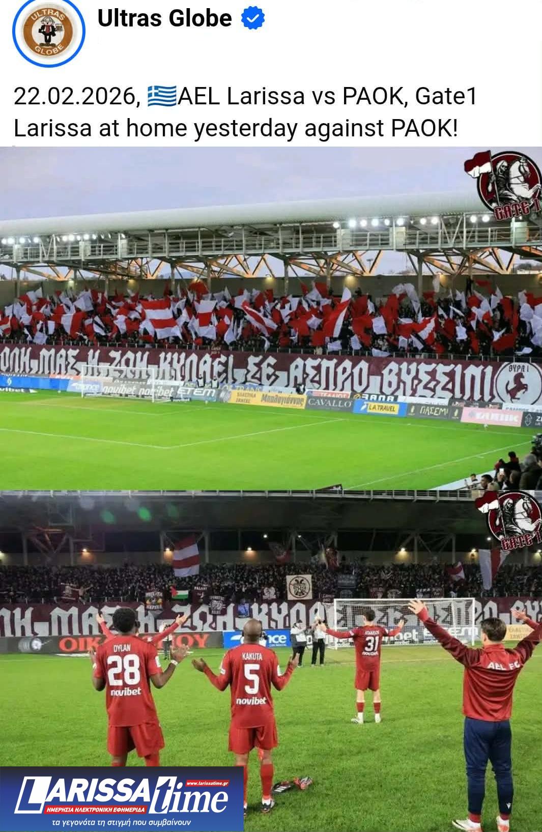 Μία οπαδική σελίδα στο facebook, Ultras Globe, η οποία αριθμεί περισσότερα από 190.000 μέλη, ανάρτησε για ακόμα μια φορά φωτογραφίες από την εξέδρα των οργανωμένων της ΑΕΛ από την εντός έδρας αναμέτρηση με τον ΠΑΟΚ, από το AEL FC ARENA.