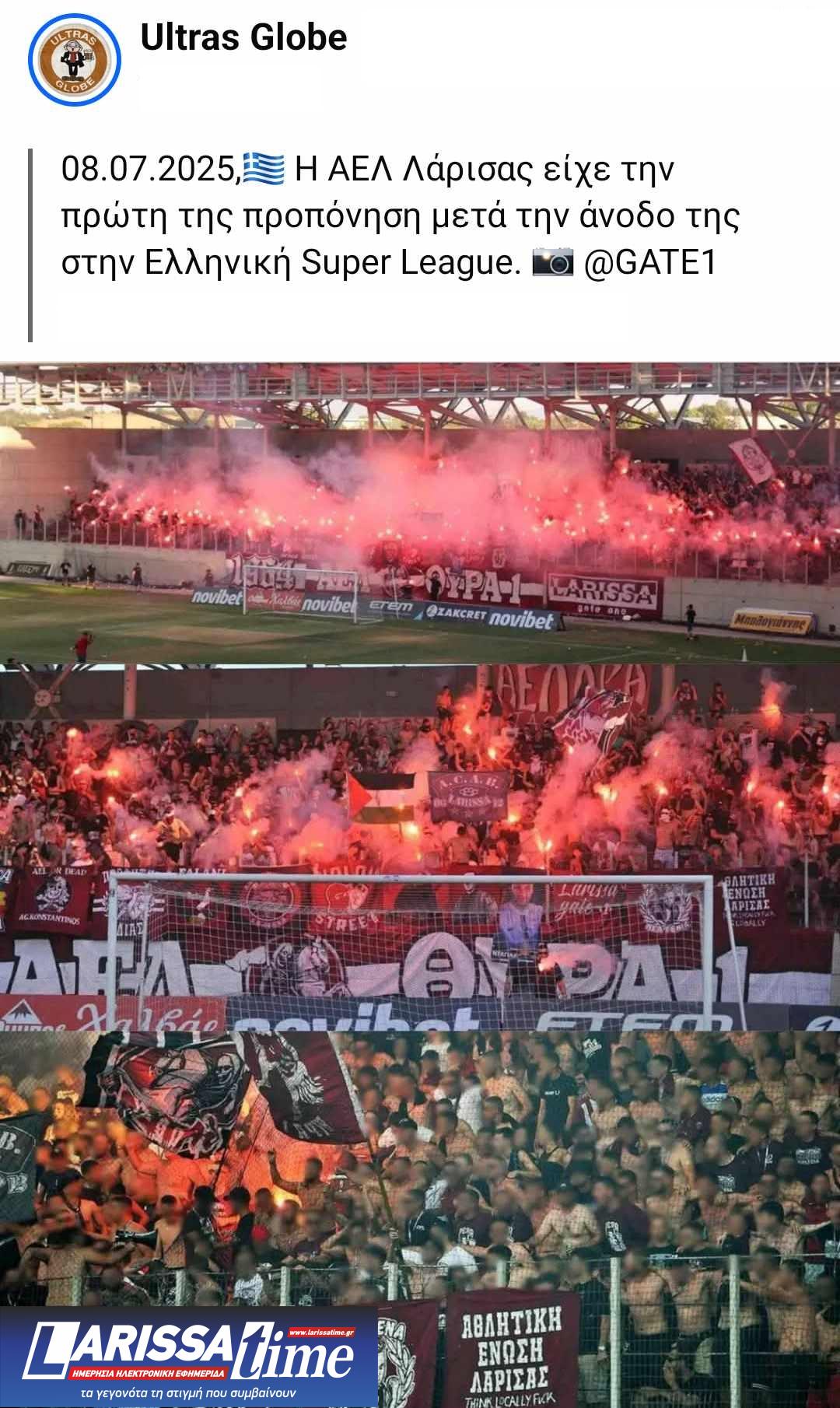 To Ultras Globe, μία οπαδική σελίδα στο facebook, η οποία αριθμεί κοντά στα 100.000 μέλη, ανάρτησε φωτογραφίες από την πρώτη προπόνηση της ΑΕΛ για τη σεζόν 2025-2026, από το φλεγόμενο AEL FC Arena.