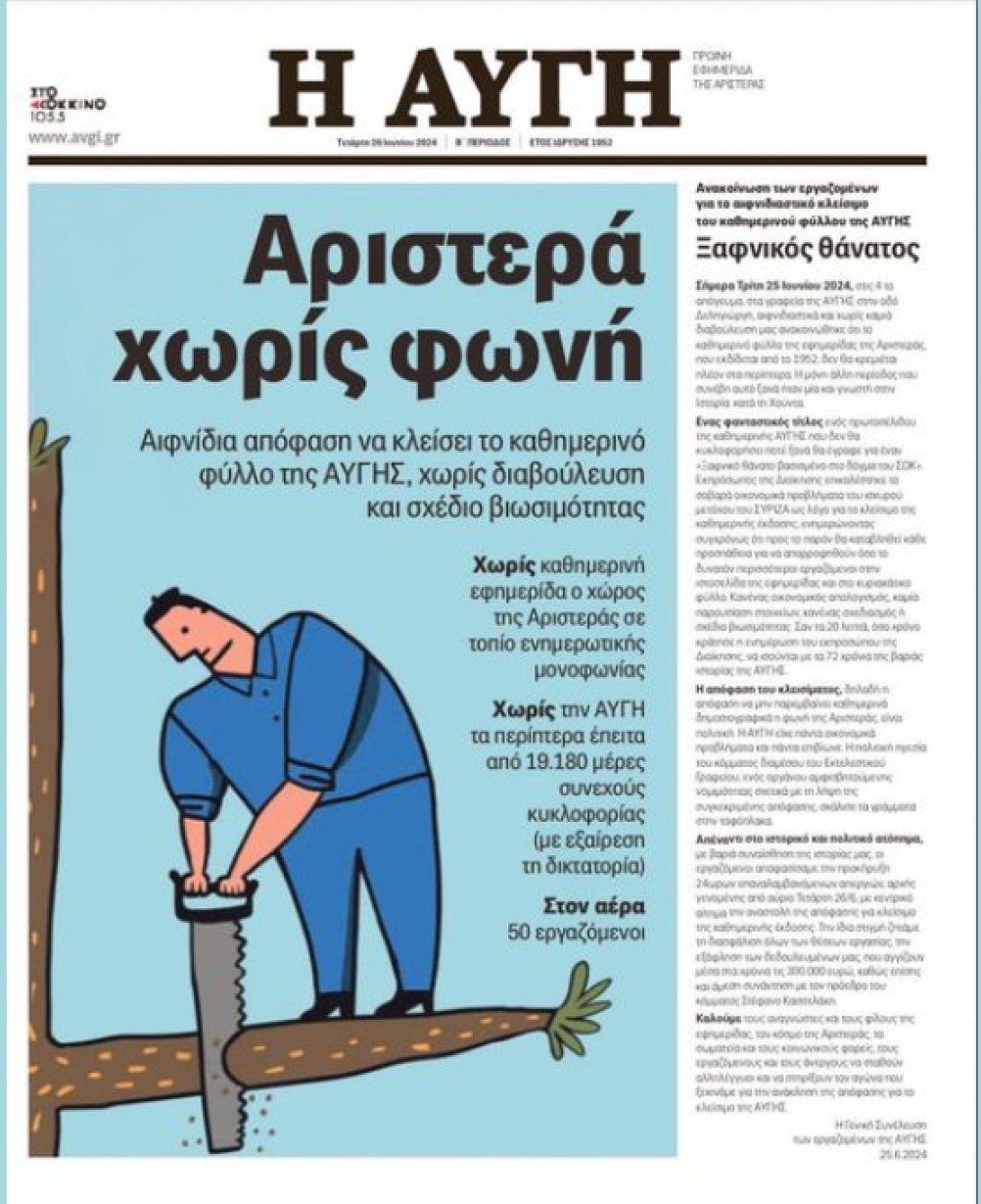 Στο σκίτσο του τελευταίου πρωτοσέλιδου της εφημερίδας «Αυγή», αποτυπώνεται ένας άνθρωπος, ο οποίος φαίνεται να κόβει με πριόνι το κλαδί στο οποίο ο ίδιος στέκεται, και από πάνω γράφει «Αριστερά χωρίς φωνή», ενώ στα δεξιά υπάρχει η ανακοίνωση των εργαζομένων του ιστορικού εντύπου.