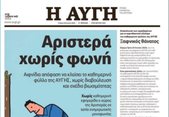 Στο σκίτσο του τελευταίου πρωτοσέλιδου της εφημερίδας «Αυγή», αποτυπώνεται ένας άνθρωπος, ο οποίος φαίνεται να κόβει με πριόνι το κλαδί στο οποίο ο ίδιος στέκεται, και από πάνω γράφει «Αριστερά χωρίς φωνή», ενώ στα δεξιά υπάρχει η ανακοίνωση των εργαζομένων του ιστορικού εντύπου.