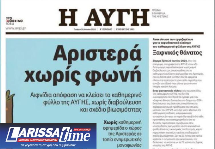 Σήμερα Τρίτη 25 Ιουνίου 2024 στις 4 το απόγευμα στα γραφεία της Αυγής στην οδό Δεληγιώργη, αιφνιδιαστικά και χωρίς καμιά διαβούλευση, μας ανακοινώθηκε ότι το καθημερινό φύλλο της εφημερίδας της Αριστεράς που εκδίδεται από το 1952, δεν θα κρεμιέται πλέον στα περίπτερα. Η μόνη άλλη περίοδος που συνέβη αυτό ξανά ήταν μία και γνωστή στην ιστορία: στη χούντα.