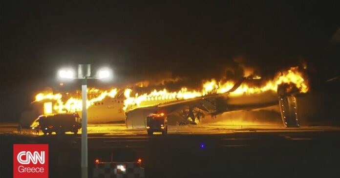 Το αεροσκάφος της Japan Airlines τυλίχτηκε στις φλόγες μετά τη σύγκρουση και οι πυροσβέστες έδωσαν μάχη για να κατασβήσουν την φωτιά. Η αεροπορική εταιρεία ανακοίνωσε ότι και οι 379 επιβαίνοντες σε αυτό απομακρύνθηκαν με ασφάλεια.