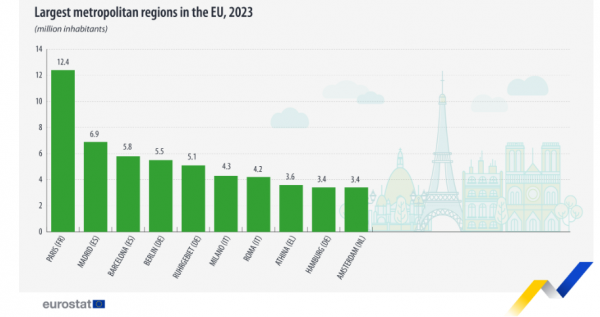 Πέντε μητροπολιτικές περιοχές στην ΕΕ είχαν περισσότερους από 5 εκατ. κατοίκους, με πρώτη την περιοχή του Παρισιού με 12,4 εκατομμύρια. Ακολουθούσαν η Μαδρίτη με 6,9 και η Βαρκελώνη με 5,8 εκατομμύρια, το Βερολίνο με 5,5 εκατομμύρια και η περιοχή του Ρουρ στη Γερμανία (5,1 εκατομμύρια).