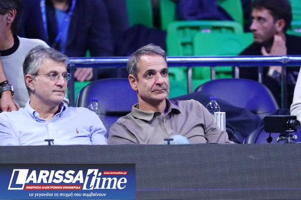 Ο πρωθυπουργός έχει πάρει θέση δίπλα στο κορτ στο Telekom Center Athens για να δει από κοντά το σπουδαίο παιχνίδι.