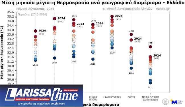 Ο φετινός Αύγουστος (όπως ο Ιούνιος και ο Ιούλιος) χαρακτηρίστηκε από πολλές και συνεχόμενες ημέρες με μεγάλες θετικές αποκλίσεις θερμοκρασίας και ήταν o πιο θερμός Αύγουστος από το 2010 στη βόρεια – δυτική Ελλάδα, στο Ιόνιο και στην Πελοπόννησο, με τις μέσες μηνιαίες τιμές να κυμαίνονται έως και +1.8 °C πάνω από τα κανονικά για την εποχή επίπεδα. Στα υπόλοιπα γεωγραφικά διαμερίσματα (με εξαίρεση την Θεσσαλία 3ος θερμότερος) καταγράφηκε ως ο 2ος θερμότερος από το 2010 (παραμένει ως θερμότερος ο Αύγουστος του 2021).