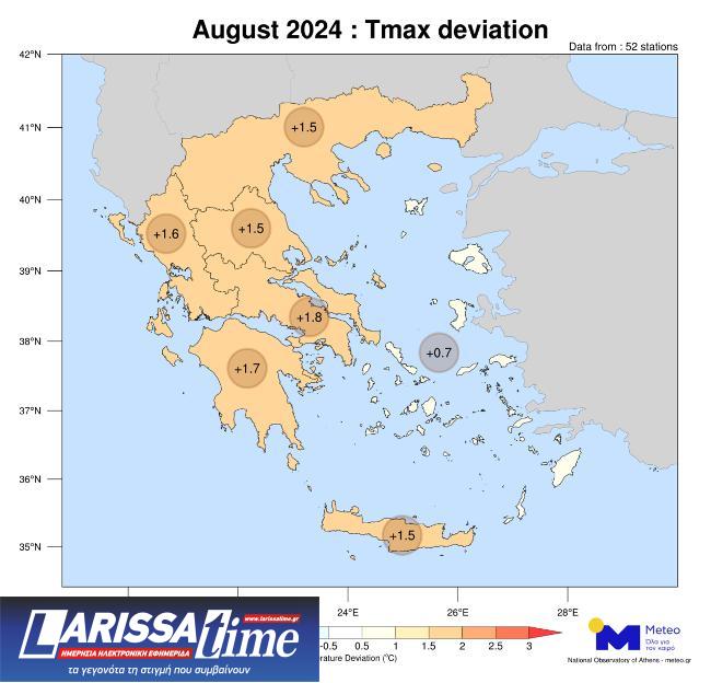 Σύμφωνα με το δίκτυο των 53 μετεωρολογικών σταθμών του meteo.gr του Εθνικού Αστεροσκοπείου Αθηνών (Ε.Α.Α) που λειτουργούν ανελλιπώς από το 2010 μέχρι σήμερα, τον φετινό Αύγουστο η μέση τιμή των μεγίστων ημερήσιων θερμοκρασιών κυμάνθηκε σε υψηλά επίπεδα στο σύνολο της χώρας, σε σχέση με τον μέσο όρο της περιόδου 2010-2019.