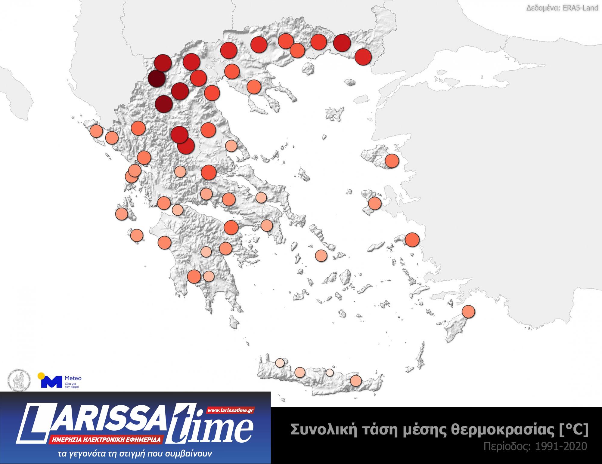 Όσον αναφορά τη θερμοκρασία, η Εικόνα 1 παρουσιάζει την τάση μεταβολής της μέσης ημερήσιας θερμοκρασίας την τριακονταετία 1991-2020 για όλες τις πρωτεύουσες των περιφερειακών ενοτήτων της χώρας. Όπως διακρίνεται στην Εικόνα 1, στο σύνολο του Ελλαδικού χώρου η τάση αυτή είναι αυξητική. Κατά μέσο όρο και για το σύνολο της ελληνικής επικράτειας, η τάση αύξησης είναι περίπου 0.05 °C ανά έτος, το οποίο σημαίνει ότι η μέση θερμοκρασία στη χώρα έχει αυξηθεί περίπου 1.5 °C κατά τα τελευταία 30 έτη.