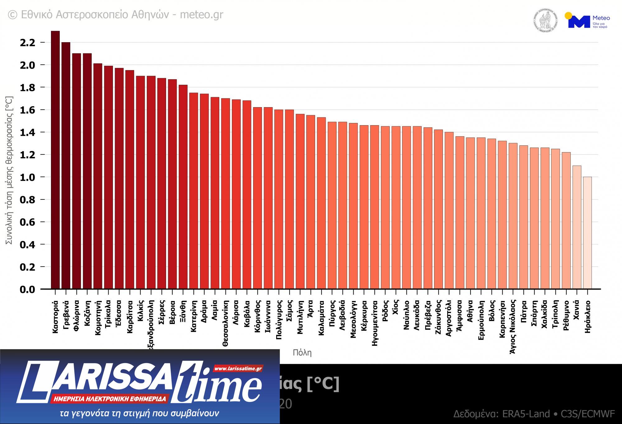 Για σύγκριση, σημειώνουμε ότι στον πλανήτη η μέση θερμοκρασία έχει αυξηθεί 0.6-0.8 °C κατά την ίδια περίοδο, ενώ στη Ευρώπη κατά 1.2 βαθμούς.