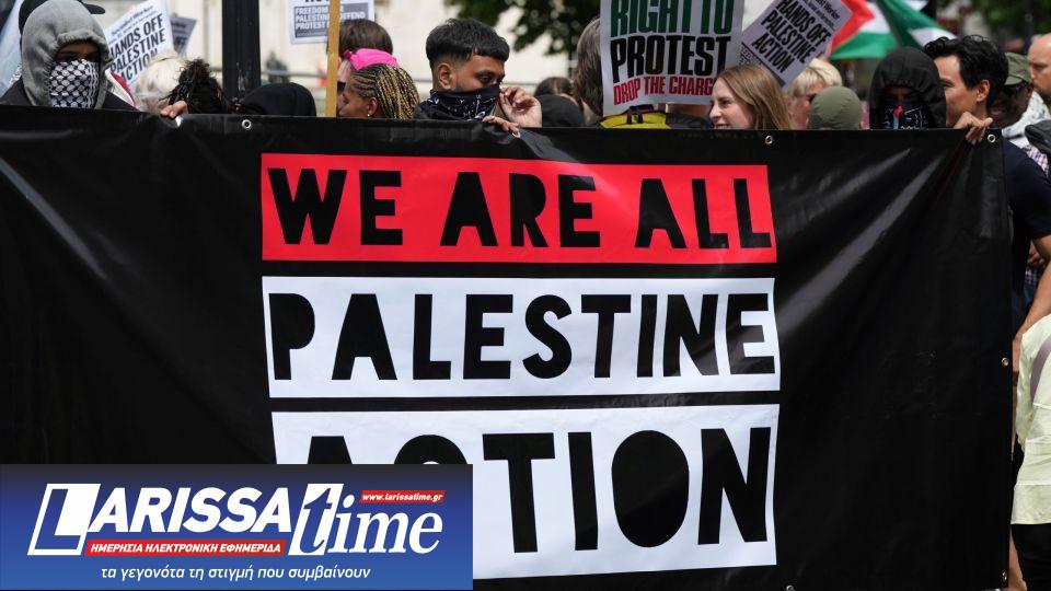 Διαδηλωτές της ομάδας Palestine Action κρατούν πανό υπέρ της Παλαιστίνης σε κινητοποίηση που έλαβε χώρα στο λονδίνο στις 23 Ιουνίου 2025.