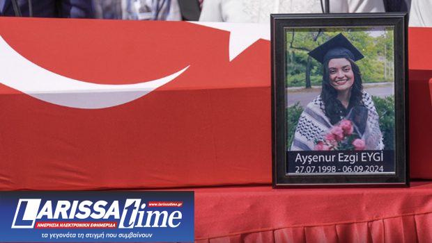 Εκατοντάδες άνθρωποι κρατώντας τουρκικές και παλαιστινιακές σημαίες συγκεντρώθηκαν σήμερα για την κηδεία της Τουρκοαμερικανίδας ακτιβίστριας Αϊσενούρ Εζγκί Εϊγκί, που σκοτώθηκε στη διάρκεια διαδήλωσης στην κατεχόμενη Δυτική Όχθη.