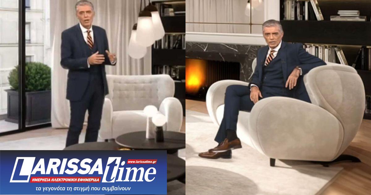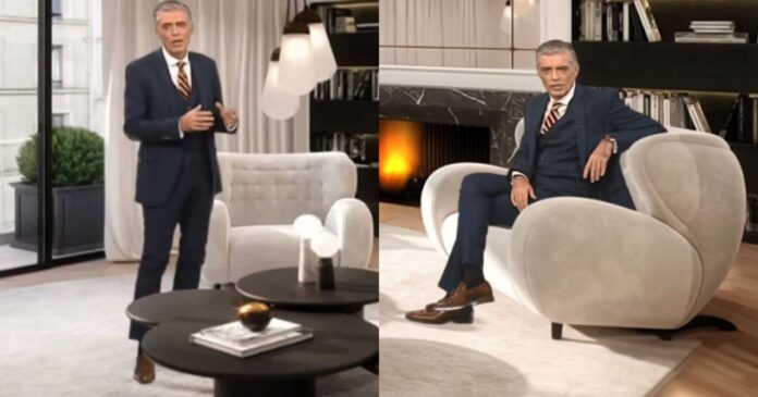 Ειδικότερα, με τη βοήθεια των γραφικών, ο παρουσιαστής και δημοσιογράφος μπήκε στο ιβουάρ σαλόνι και στάθηκε μπροστά στο coffee table, δείχνοντας στους τηλεθεατές το εντυπωσιακό τζάκι και στη συνέχεια κάθισε στον μικρότερο από τους δύο καναπέδες και πήγε πίσω από το μαρμάρινο μπαρ του διαμερίσματος.