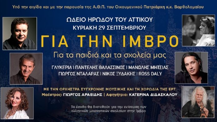 Μια ξεχωριστή συναυλία, αφιερωμένη στα ελληνικά μειονοτικά σχολεία της Ίμβρου, θα πραγματοποιηθεί την Κυριακή 29 Σεπτεμβρίου 2024 και ώρα 20:30, στο Ωδείο Ηρώδου τουΑττικού.