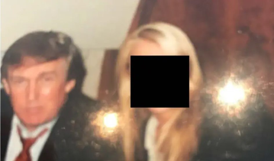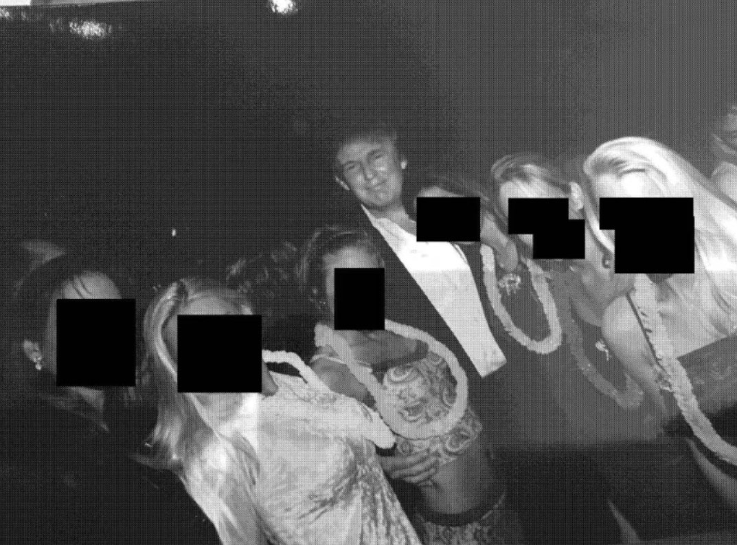 Άλλη φωτογραφία δείχνει τον Τραμπ με έξι γυναίκες με λουλούδια γύρω από τον λαιμό, των οποίων τα πρόσωπα έχουν καλυφθεί από την επιτροπή.