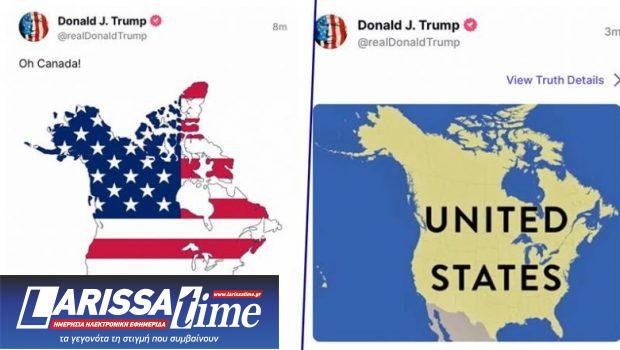 Ο εκλεγμένος πρόεδρος των ΗΠΑ Ντόναλντ Τραμπ δημοσίευσε έναν χάρτη που δείχνει τον Καναδά ως μέρος των ΗΠΑ σε ανάρτησή στη δική του πλατφόρμα κοινωνικής δικτύωσης Truth Social. Η κίνηση αυτή έρχεται μετά από την εκτόξευση απειλών του επερχόμενου προέδρου σε γειτονικά κράτη των ΗΠΑ το τελευταίο διάστημα και ενώ πλησιάζει η ημέρα ορκωμοσίας του.