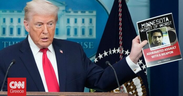 Στην συνέχεια έδειξε φωτογραφίες αλλοδαπών κακοποιών που βρίσκονταν στις ΗΠΑ εξαιτίας της «πολιτικής ανοιχτών συνόρων» του προηγούμενου προέδρου Τζο Μπάιντεν. Δείχνει φωτογραφίες, όπως λέει, ανθρώπων που μπήκαν στις ΗΠΑ, και ζούσαν στην Μινεσότα.