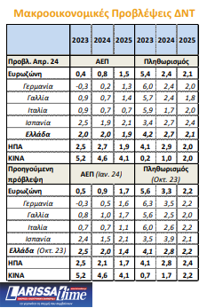 Το ΔΝΤ στην έκθεση “World Economic Outlook” προβλέπει ότι ο ρυθμός ανάπτυξης της οικονομίας θα διατηρηθεί το 2024 στο 2,0% (2023:2,0%) και στο 1,9% το 2025. Ταυτόχρονα αναμένεται σταδιακή πτώση του ποσοστού ανεργίας στο 9,4% το 2024 και 8,7% το 2025 ενώ ο εναρμονισμένος πληθωρισμός θα αποκλιμακωθεί σταδιακά στο 2,1% το 2025, σύμφωνα με το Δελτίο Οικονομικών Εξελίξεων της Τράπεζας Πειραιώς.