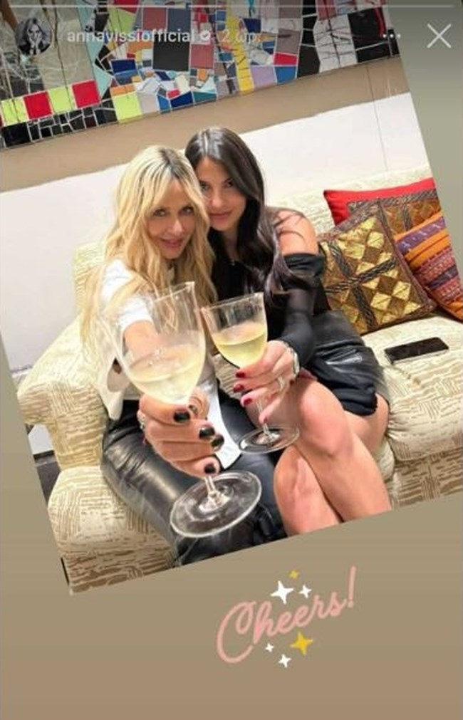 Στη συνέχεια μοιράστηκε μία φωτογραφία με την οικοδέσποινα, Δήμητρα Κούστα. Κρατώντας από ένα ποτήρι κρασί, η Άννα Βίσση και η Δήμητρα Κούστα πόζαραν αγκαλιασμένες στον καναπέ. Η Δήμητρα που έγινε για τρίτη φορά μαμά πριν από τρεις μήνες, φορά μία επίσης μαύρη δερμάτινη μίνι φούστα και ένα chic off shoulder τοπ. Ο καναπές είναι μπεζ με πιο σκούρα μπεζ μοτίβα και είναι θα έλεγε κανείς, έθνικ αισθητικής. Το ίδιο και τα μαξιλάρια.