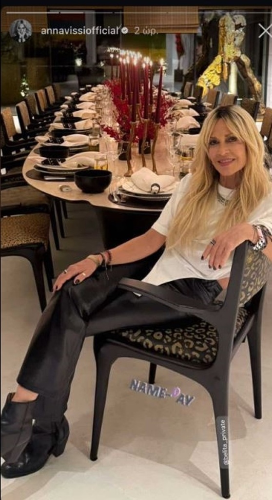 Σε έργο Τέχνης παραπέμπει η τραπεζαρία, μαύρη με λευκή επιφάνεια και εμπριμέ καθίσματα. Ήταν διακοσμημένη με κόκκινα λουλούδια που έδιναν μία χριστουγεννιάτικη πινελιά και ψηλά κόκκινα αναμμένα κεριά. Η Άννα Βίσση κάθισε μπροστά από την τραπεζαρία και πόζαρε άνετη και χαμογελαστή στον προσωπικό της λογαριασμό στο Instagram. “Η γιορτή μου”, έγραψε.