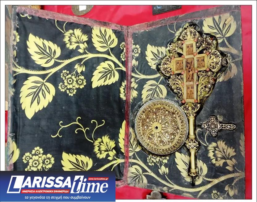 - Ξύλινη δίπτυχη κασετίνα, με εσωτερική υφασμάτινη επένδυση, περιέχουσα τρία αντικείμενα και συγκεκριμένα, μεταλλικό σταυρό ευλογίας με ξύλινο πυρήνα, μεταλλική κυκλική βάση του σταυρού και αυτοτελή μικρό μεταλλικό σταυρό με κρίκο ανάρτησης στο πάνω μέρος του σταυρού, κατασκευασμένα με συρματερή τεχνική και κοκκίδωση με επίθετους ημιπολύτιμους λίθους.