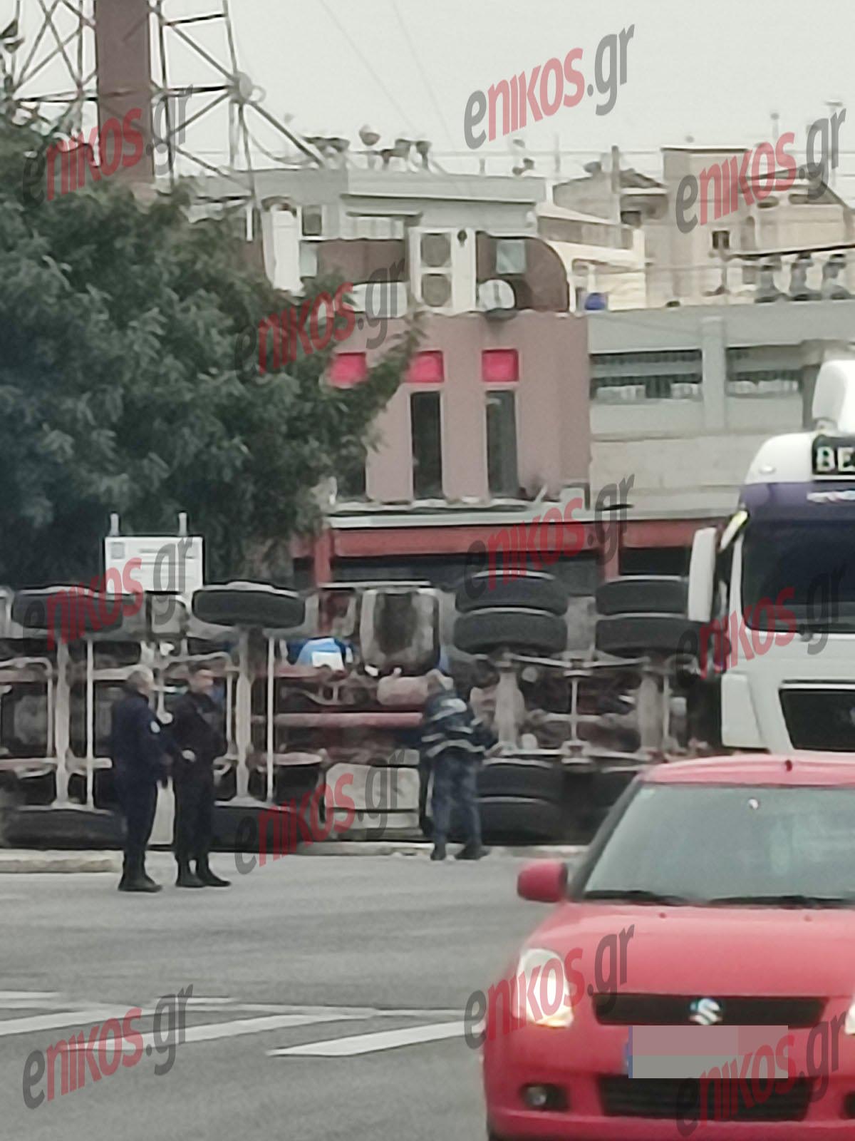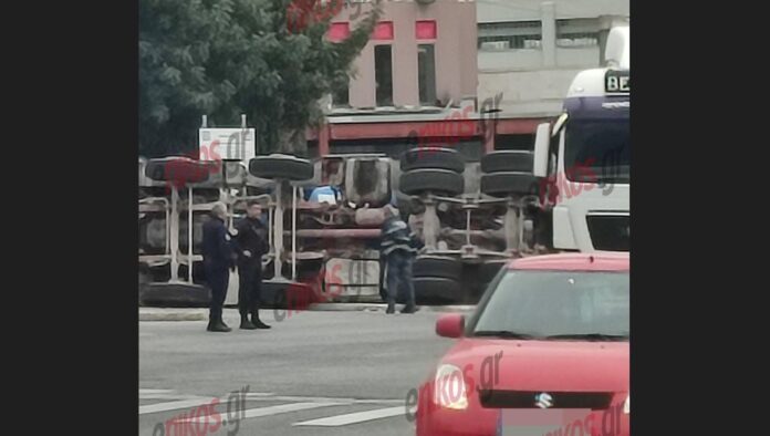 Όπως φαίνεται στις φωτογραφίες και το βίντεο που έστειλε αναγνώστης στο enikos.gr, η νταλίκα έχει αναποδογυρίσει στο οδόστρωμα και σύμφωνα με πληροφορίες, στο τροχαίο ενεπλάκη και ένα ΙΧ αυτοκίνητο.