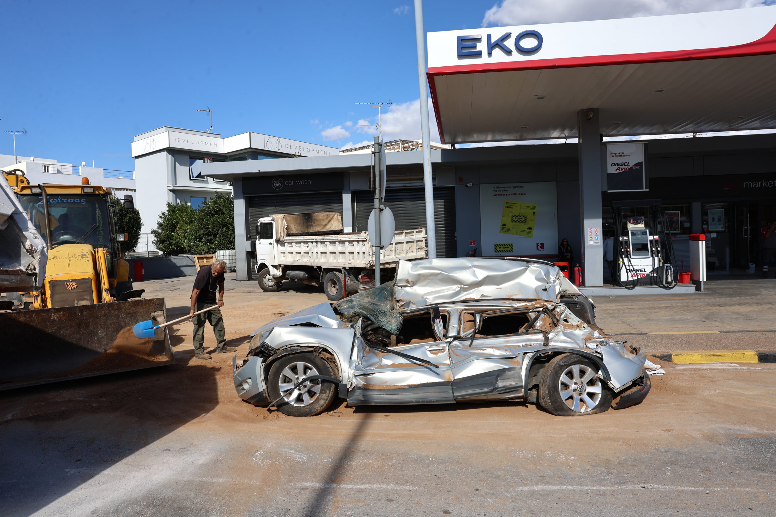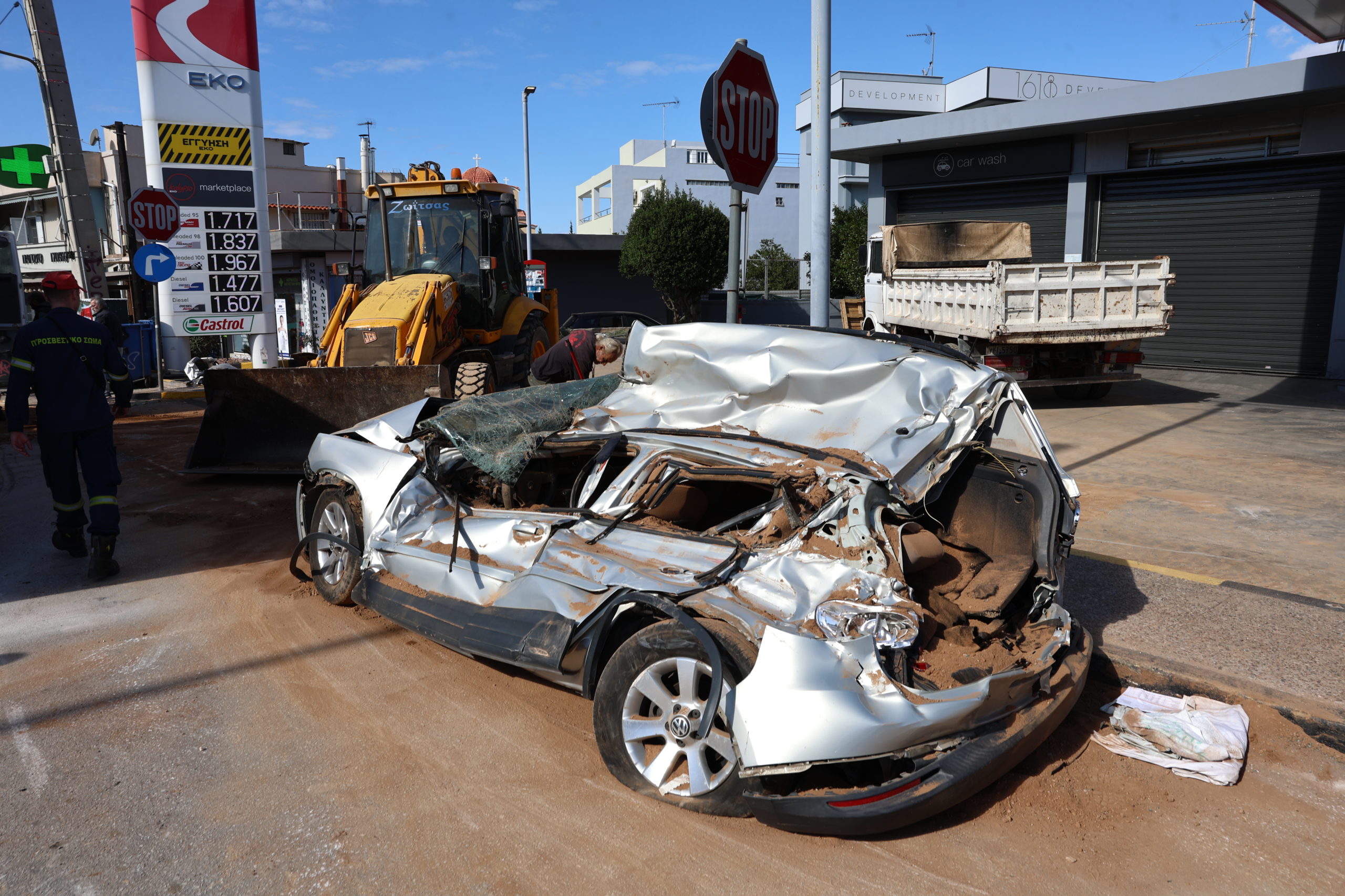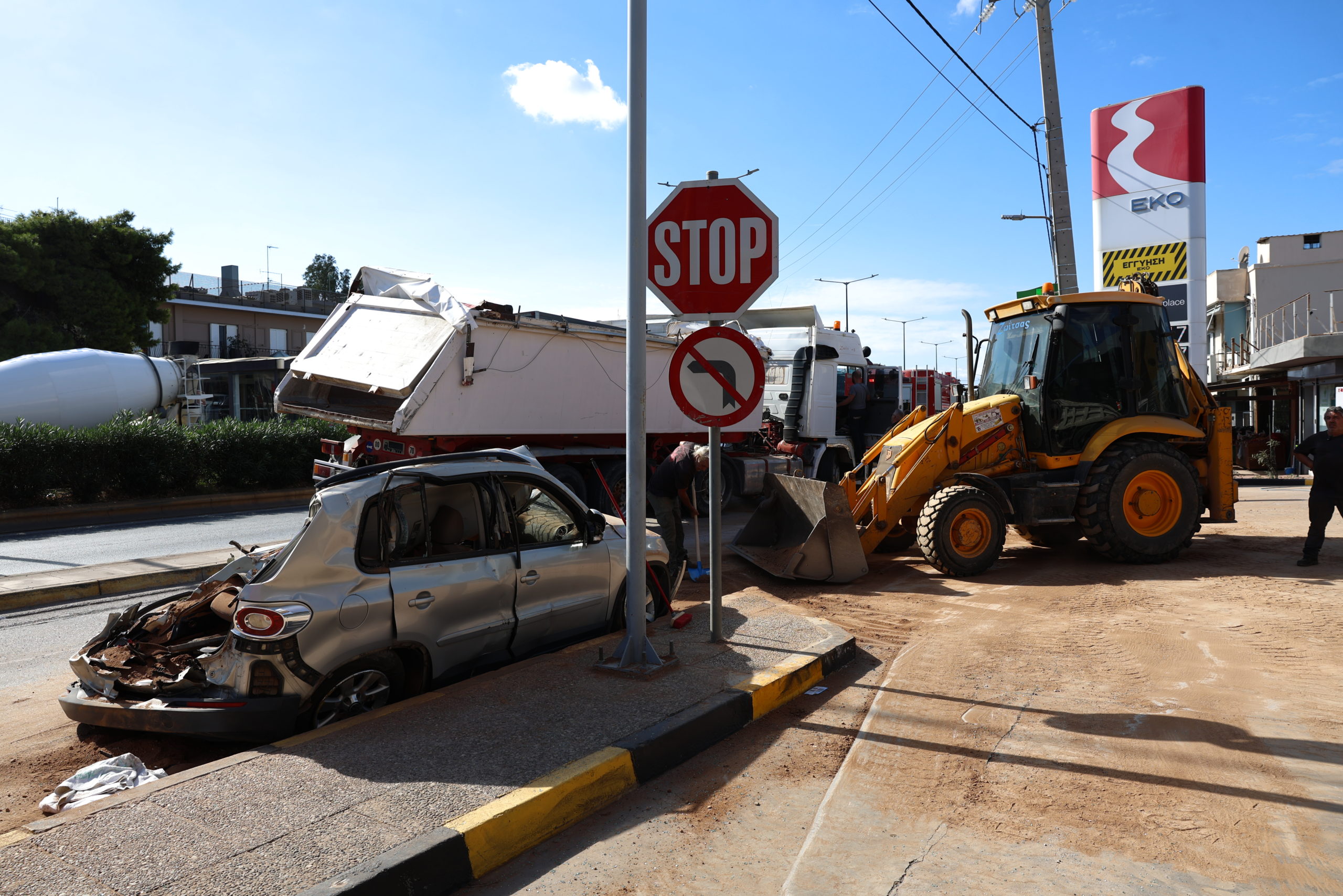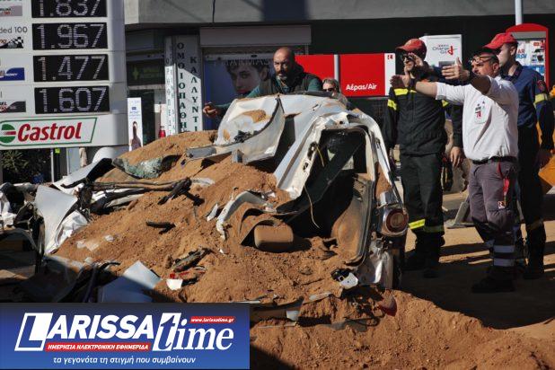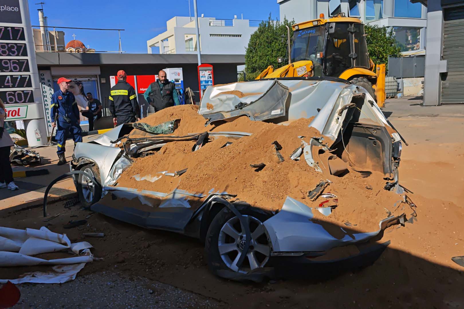 «Έλιωσε» το αυτοκίνητο που ήταν σταθμευμένο, στη λεωφόρο Ευελπίδων, στα Βλάχικα της Βάρης, στο ρεύμα προς Βούλα, και καταπλακώθηκε από μία νταλίκα που μετέφερε σακιά με χώμα.