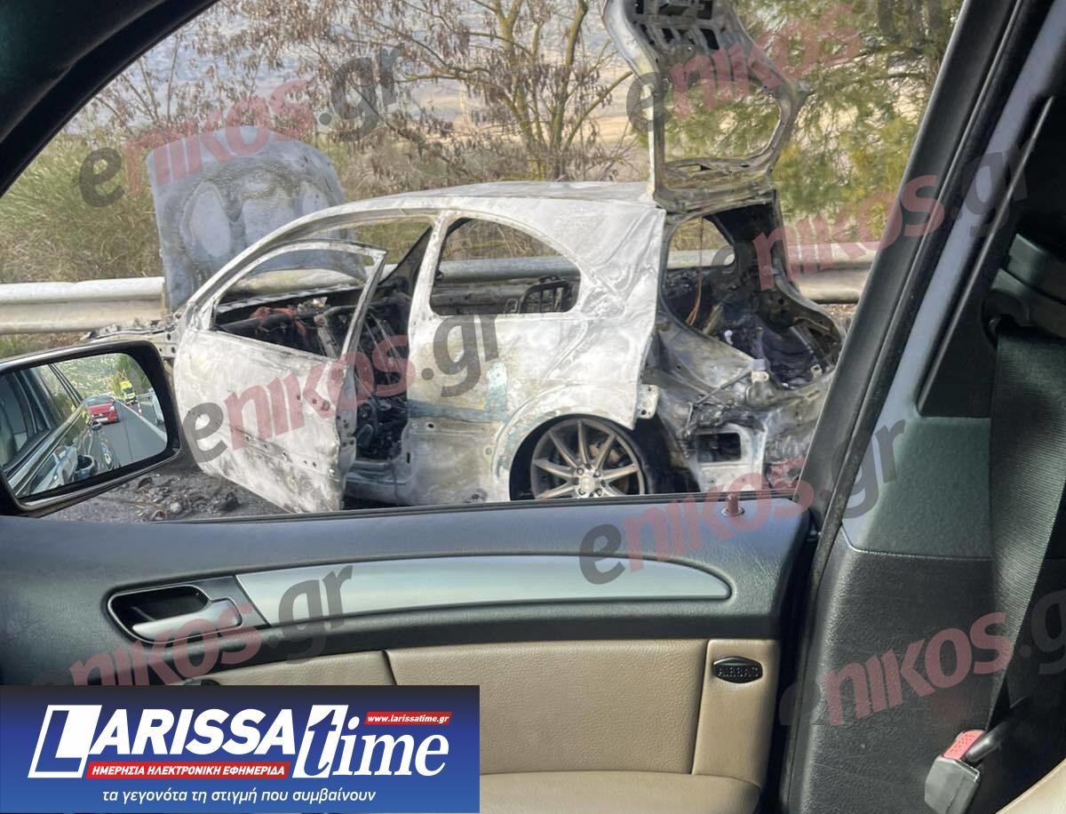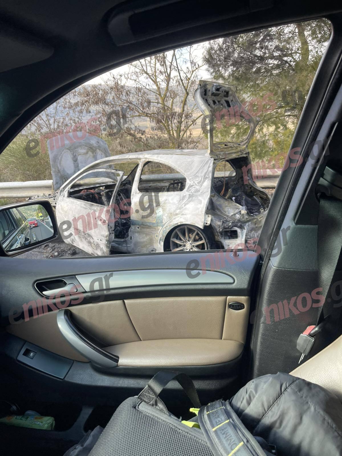 Μάλιστα, όπως φαίνεται και στη φωτογραφία που απέστειλε στο enikos.gr αναγνώστης, το όχημα που ενεπλάκη στο τροχαίο καταστράφηκε ολοσχερώς έπειτα από εκδήλωση πυρκαγιάς.