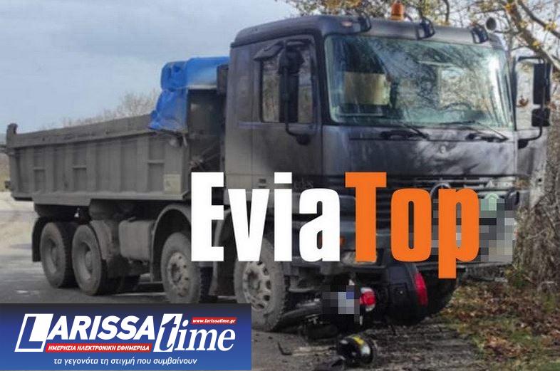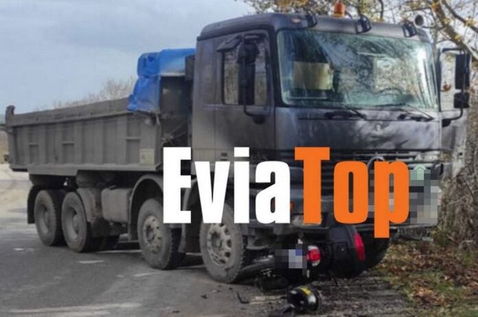 Ο άτυχος άνδρας βρέθηκε με τη μηχανή του κάτω από τις ρόδες του μεγάλου οχήματος και τραυματίστηκε πολύ σοβαρά στο πόδι, σύμφωνα με το eviatop από όπου και η φωτογραφία.