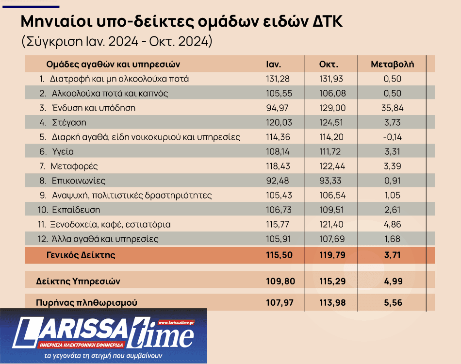 Συνεπώς, καθίσταται σαφές ότι οι «βαριές» συνιστώσες του πληθωρισμού έχουν αλλάξει πεδίο. Για παράδειγμα η κατηγορία «Ξενοδοχεία, καφές, εστιατόρια» έχει αυξηθεί κατά 4,86% μεταξύ Ιανουαρίου-Οκτωβρίου 2024, κάτι που σχετίζεται -μεταξύ άλλων- και με τον τουρισμό.