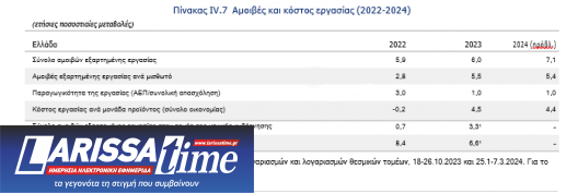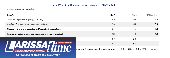»Το 2024 οι μέσες αποδοχές και το κόστος εργασίας ανά μονάδα προϊόντος αναμένεται ότι θα εξακολουθήσουν να αυξάνονται με ρυθμούς ανάλογους του 2023, ενώ η άνοδος της παραγωγικότητας θα παραμείνει περιορισμένη. Η άνοδος των αποδοχών το 2024 θα επηρεαστεί τόσο από την αύξηση των μισθών των δημοσίων υπαλλήλων όσο και από τη λήξη16 της αναστολής των επιδομάτων προϋπηρεσίας (τριετιών) των μισθωτών του ιδιωτικού τομέα, η οποία είχε νομοθετηθεί κατά την περίοδο των προγραμμάτων οικονομικής προσαρμογής. Επιπλέον, επισπεύσθηκε νομοθετικά η διαδικασία καθορισμού του κατώτατου μισθού,17 προκειμένου να χορηγηθεί νέα αύξηση από 1ης Απριλίου 2024.»