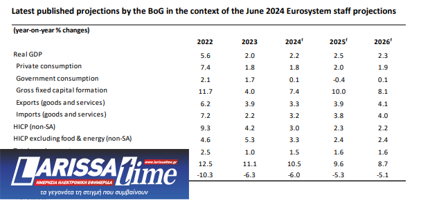 Αναφορικά με τον πληθωρισμό, η ΤτΕ εκτιμά ότι θα παραμείνει πάνω από το 2% και το 2026. Ειδικότερα, προβλέπει ότι από το φετινό 3% θα «πέσει» στο 2,3% το 2025 και στο 2,2% το 2026.