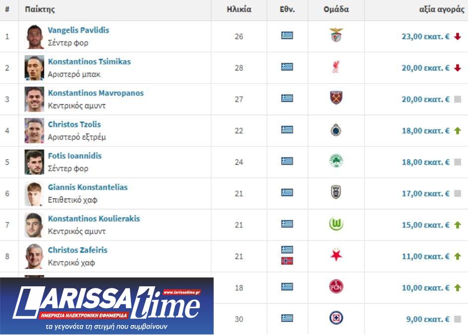 Αντίθετα, στη γενικότερη κατάταξη των Ελλήνων ποδοσφαιριστών, ανεξαρτήτως χώρας δραστηριότητας, η κατάσταση παραμένει σχετικά σταθερή. Στην κορυφή δεσπόζει ο Βαγγέλης Παυλίδης, με την αξία του να ανέρχεται στα 23 εκατομμύρια ευρώ, αν και παρατηρήθηκε μία μικρή πτώση. Στη δεύτερη θέση βρίσκεται ο Κώστας Τσιμίκας, του οποίου η κοστολόγηση έπεσε στα 20 εκατομμύρια ευρώ, ενώ το ίδιο ποσό συνοδεύει και τον Ντίνο Μαυροπάνο, ο οποίος συμπληρώνει την πρώτη τριάδα.