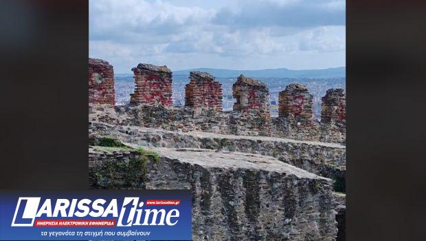 Τα τείχη στον Πύργο Τριγωνίου στην Άνω Πόλη, στη Θεσσαλονίκη, βανδάλισαν άγνωστοι, γράφοντας με κόκκινο σπρέι συνθήματα.