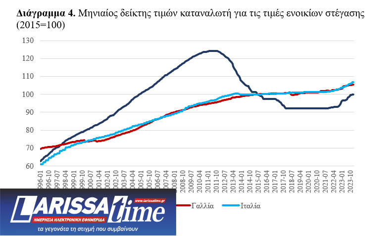 Το διάγραμμα είναι ενδεικτικό της μεγάλης αύξησης των τιμών κατά το 2022 για τη στέγαση, τάση που αποκλιμακώθηκε ελαφρώς το 2023 (παρότι οι τιμές παραμένουν σε σημαντικά υψηλό επίπεδο).