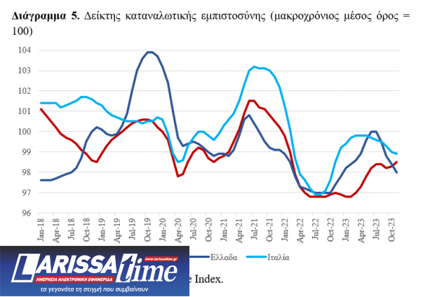 Για την ελληνική οικονομία, ο δείκτης εμφανίζει σημαντική ανοδική τάση από τα μέσα του 2018 μέχρι τα μέσα του 2019, δηλώνοντας αυξημένη αισιοδοξία. Ωστόσο, ακολουθεί μια περίοδος σταθεροποίησης και στη συνέχεια πτώσης μετά την έναρξη της πανδημίας, πράγμα που υποδεικνύει τις ανησυχίες που προκλήθηκαν από τις υγειονομικές και οικονομικές συνέπειες της πανδημίας του COVID-19. Η περίοδος από το 2021 έως το 2023 φαίνεται να είναι μια περίοδος σταθεροποίησης και ελαφράς ανάκαμψης, παρόλο που τα επίπεδα δεν επιστρέφουν στα προ-πανδημικά επίπεδα, υποδηλώνοντας πιθανώς μακροπρόθεσμες ανησυχίες για την οικονομία.