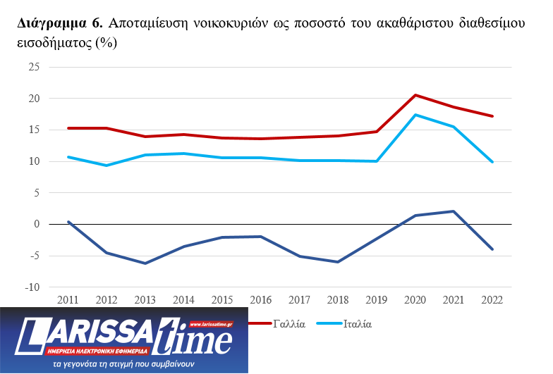 Μάλιστα στο διάγραμμα φαίνεται να αποκαλύπτει μια αρκετά ανησυχητική τάση για την Ελλάδα το 2022, με το ποσοστό αποταμίευσης να είναι αρνητικό. Αυτό σημαίνει ότι τα νοικοκυριά δαπανούσαν περισσότερα απ’ ό,τι είχαν σε διαθέσιμο εισόδημα, πιθανόν αντλώντας από προηγούμενες αποταμιεύσεις ή αυξάνοντας το δανεισμό τους. Η αυξανόμενη οικονομική πίεση, που επιδεινώθηκε από τον πληθωρισμό, μείωσε το πραγματικό διαθέσιμο εισόδημα των ανθρώπων, αναγκάζοντάς τους να διαθέσουν μεγαλύτερο μέρος του για την κάλυψη βασικών αναγκών. Το αρνητικό ποσοστό αποταμίευσης αντανακλά επίσης μια βαθύτερη ανησυχία για την οικονομική ασφάλεια των νοικοκυριών, καθώς η απουσία αποταμίευσης σημαίνει μειωμένη ικανότητα να αντιμετωπιστούν απρόβλεπτες οικονομικές ανάγκες ή εκτάκτες συνθήκες στο μέλλον. Η κατάσταση αυτή ενδέχεται να έχει περαιτέρω επιπτώσεις στην καταναλωτική εμπιστοσύνη, καθώς η ανησυχία για την οικονομική μελλοντική ασφάλεια μπορεί να καταστείλει την καταναλωτική δαπάνη, εντείνοντας την οικονομική αβεβαιότητα.