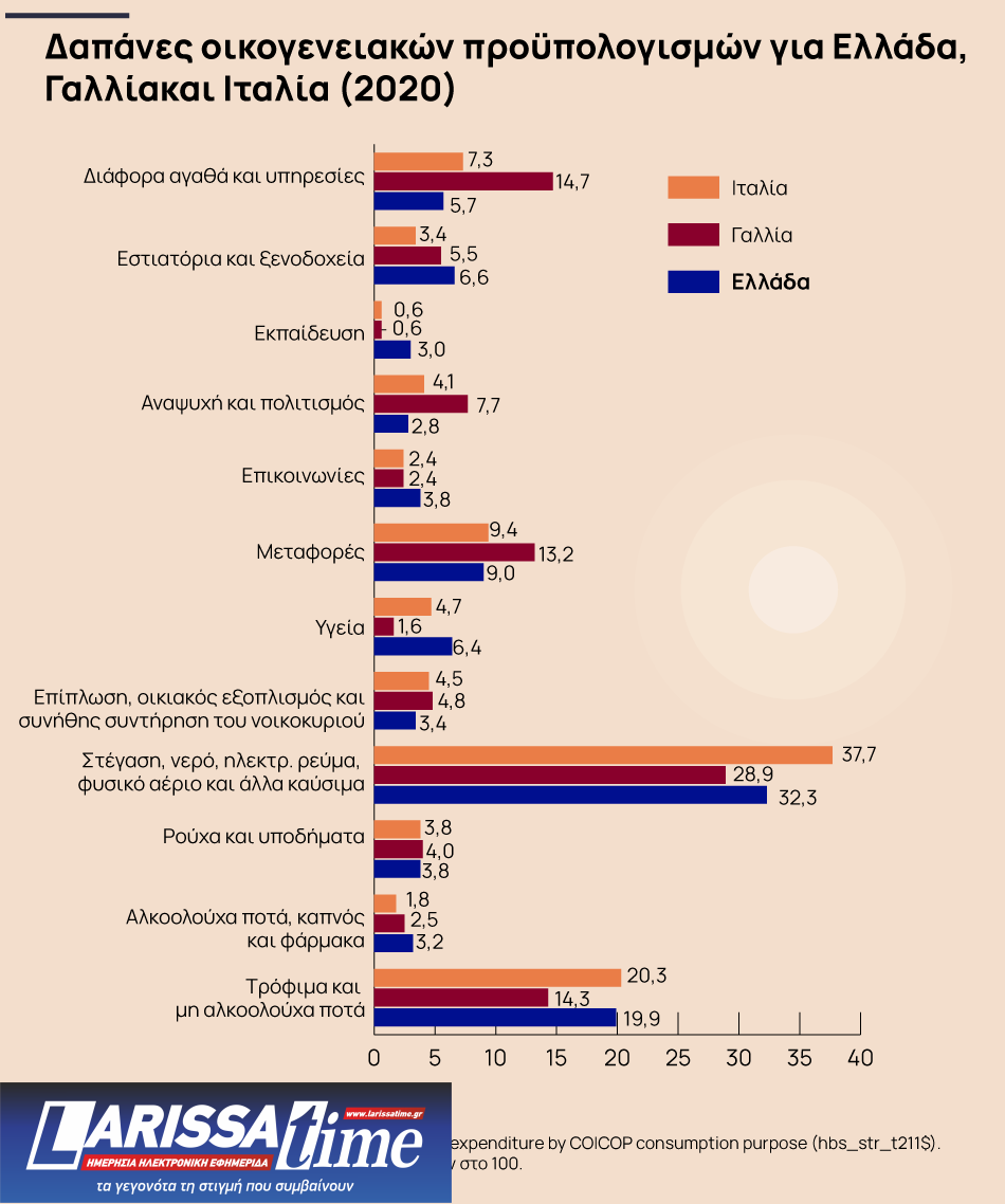 Το Διάγραμμα 1 παρουσιάζει τις δαπάνες των οικογενειακών προϋπολογισμών για συγκεκριμένες ομάδες αγαθών και υπηρεσιών, για την Ελλάδα, τη Γαλλία και την Ιταλία, για το 2020. Είναι εμφανής η μεγάλη ποσοστιαία συμμετοχή που δίνουν τα ελληνικά και τα ιταλικά νοικοκυριά για τρόφιμα και για ενέργεια.